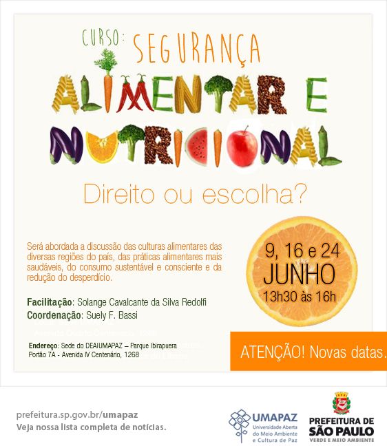 Com a proposta de difundir o conceito de Segurança Alimentar e Nutricional – SAN – e refletir sobre conhecimentos e habilidades para a escolha de alimentos de forma adequada, saudável e segura, a UMAPAZ oferece o curso Segurança Alimentar e Nutricional – SAN – Direito ou Escolha?